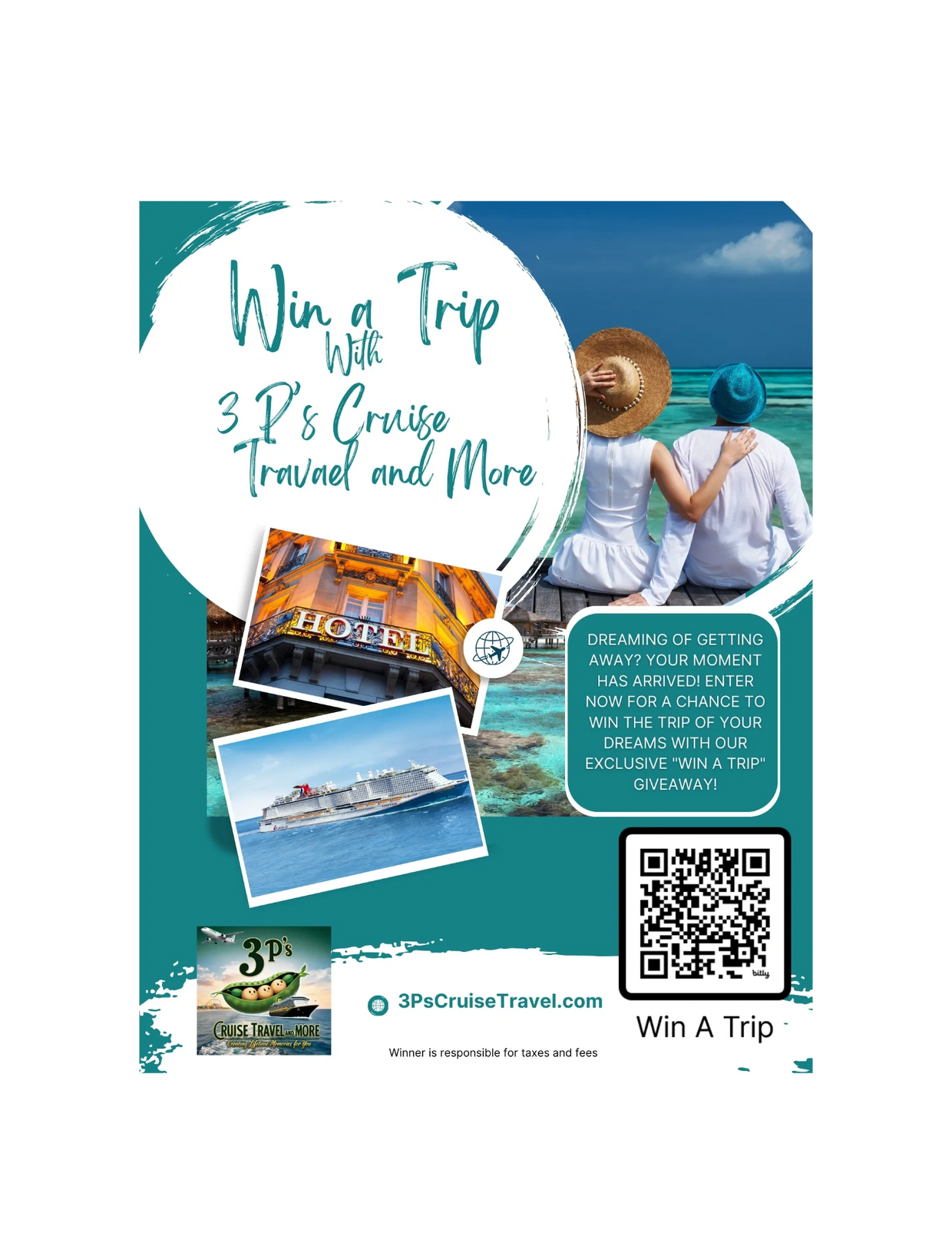2 Trips are given away quarterly. One trip will be given to those clients who have booked a trip during the quarter and one trip will be given away to those who wish to learn more about 3 P's Cruise Travel and More and the services that we provide.